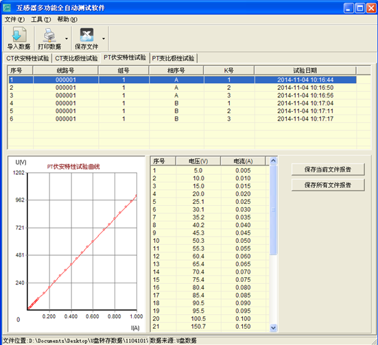 打開“PT伏安特性試驗”,通過選擇主列表的數據,查看馳宇電力互感器綜合特性測試儀對應的曲線數據和PT伏安特性試驗曲線,如圖5.16所示。其中“保存當前文件報告”和“保存所有文件報告”的使用與CT伏安特性試驗相同。