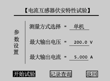 互感器綜合特性測試儀進入CT測試主界面后,轉動旋轉鼠標將光標移動至伏安特性選項并按下進入CT伏安特性試驗參數設置界面,如圖3.2所示。通過旋轉鼠標可改變當前所選擇選項的數值,將光標移動至返回,按下鼠標則可返回至CT測試主界面,CT伏安特性試驗參數設置界面各參數含義如下: