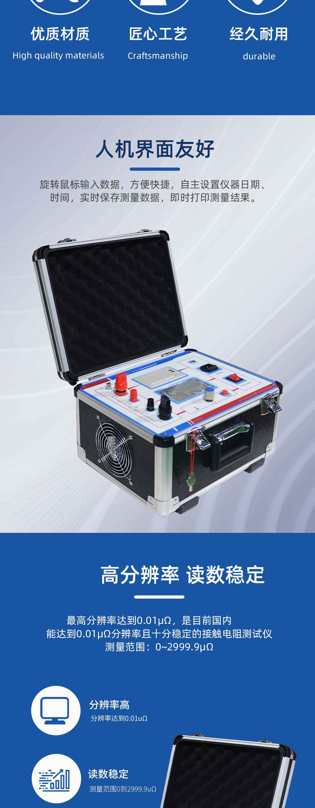 本儀器操作面板采用人體工學(xué)設(shè)計(jì),符合操作習(xí)慣,采用高頻開關(guān)電源和數(shù)字電路技術(shù),適用于開關(guān)控制設(shè)備回路電阻的測(cè)量。測(cè)試電流采用國(guó)家標(biāo)準(zhǔn)推薦的直流100A和200A。可在直流100A和200A的情況下直接測(cè)得回路電阻,測(cè)試結(jié)果用大屏幕液晶LCD顯示,并有數(shù)據(jù)存儲(chǔ)、輸出打印、時(shí)間設(shè)置等功能,另有50A、150A檔位供用戶選擇;自定義測(cè)試時(shí)間,最大設(shè)定時(shí)間599S,大于標(biāo)準(zhǔn)規(guī)定的60S;是國(guó)內(nèi)唯一能達(dá)到0.01μΩ分辨率且十分穩(wěn)定的接觸電阻測(cè)試儀,性能超過(guò)進(jìn)口大電流微歐計(jì)。符合電力、供電部門現(xiàn)場(chǎng)高壓開關(guān)維修和高壓開關(guān)廠回路電阻測(cè)試的要求。